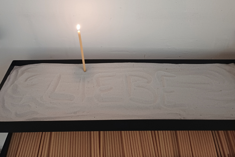 In unserer Kirche werden immer wieder auch Botschaften mit in den Sand geschrieben. Gerade steht da das Wort „Liebe“ und die Kerze dient als i-Punkt, als Ergänzung, als Ausrufezeichen! Einfach so, wie jede und jeder „seine gute Zeit“ auch deuten mag: es ist möglich! Und so wünsche ich Ihnen allen ganz persönlich von Herzen eine gute Zeit!