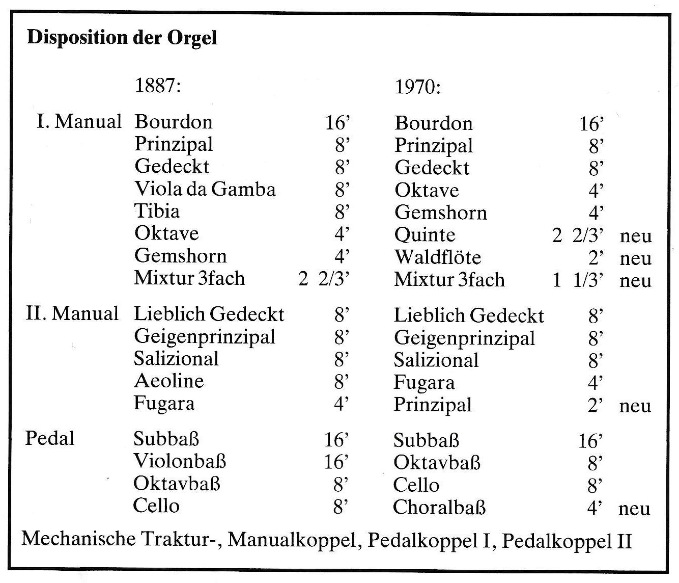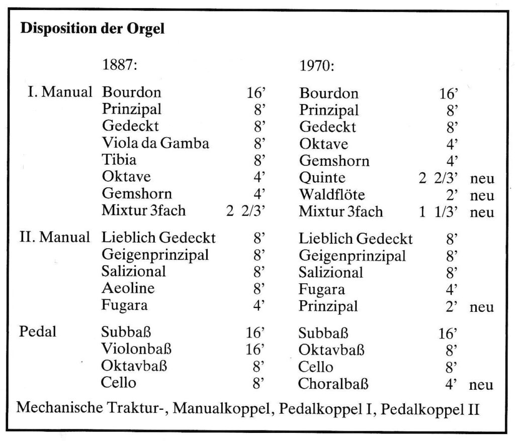 Unsere Orgel wurde um 1890 gebaut und 1970 und 1998 überholt und renoviert. Sie erklingt bei unseren Gottesdiensten und auch bei Konzerten.